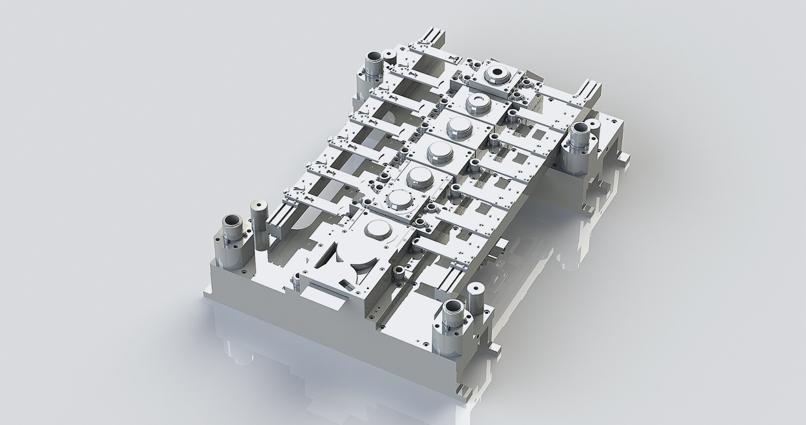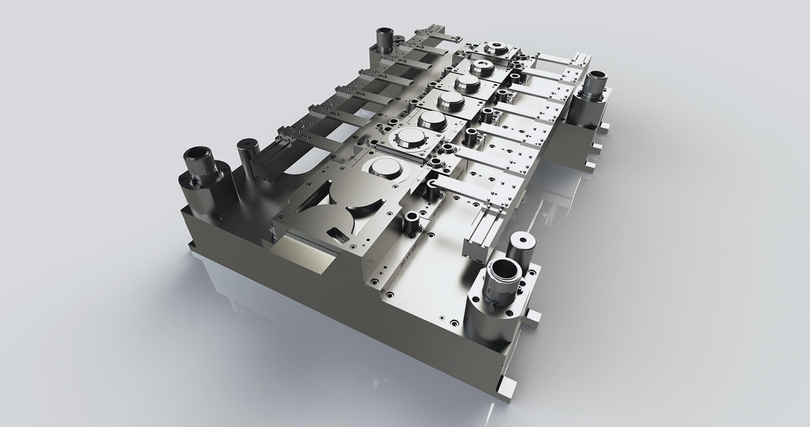 Si tratta di uno stampo per la tranciatura e deformazione della lamiera che utilizza dei sistemi esterni integrati di trasferimento del pezzo (chiamati transfer) lungo i vari passaggi dello stampo.